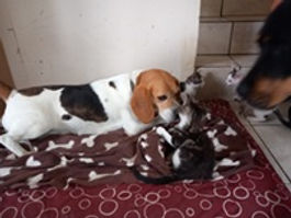 Comme vous le voyez sur les photos, notre chienne Simba lui porte beaucoup d'attention. Il aime la taquiner, elle aime s'occuper de lui.